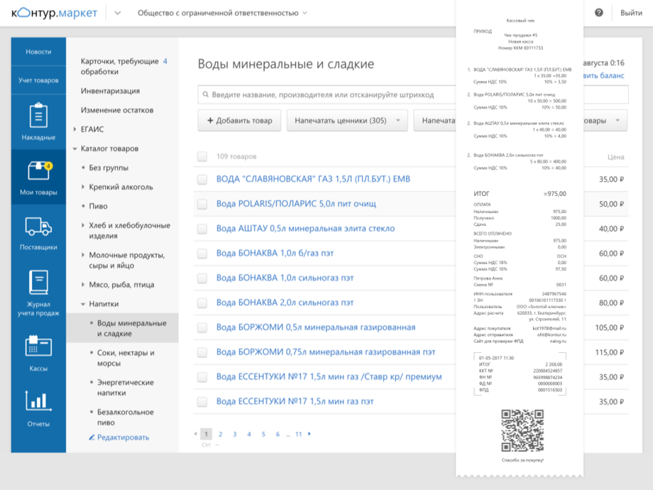В Контур.Маркете удобно вести справочник товаров и передавать его на кассу — в чеке будут печататься наименования товаров согласно требованиям 54-ФЗ.